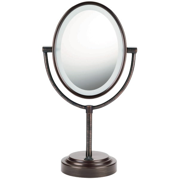 • Oval double-sided illuminated mirror ;• 9.5 in. L x 7 in. W oval design;• Rotates 360deg for regular viewing or 7x magnification;• On/off power switch;• Crystal-clear reflection glass;• Circular lighting;• Fog-free mirror;• Dishwasher safe;• Oiled Bronze;
